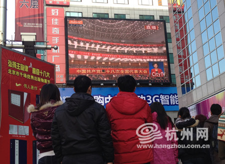 王府井商业街口,工美大厦的楼体上也在播放着十八大开幕的消息,往来的人们在经过这块屏幕时,都会放慢脚步,抬起头来观看,还有游客站在屏幕下久久没有离去。