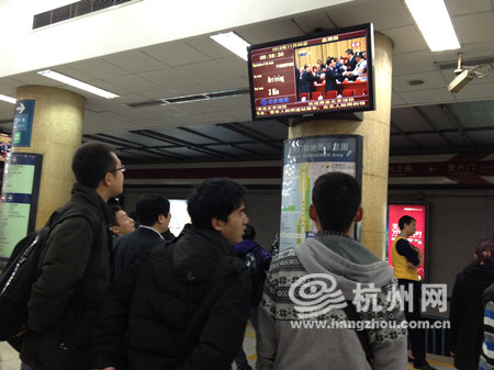 9点刚到,北京地铁复兴门站内,等车的人们就在站内的屏幕上看到了电视直播。大家纷纷驻足观看,在地铁上,也在同步播放着会场内的场景,早高峰还没有完全过去,比肩接踵的人们都把目光投向了车内的小屏幕,屏气凝神地认真凝听着胡锦涛总书记所作的报告。