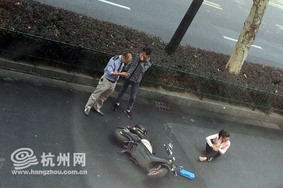 撞到他的是一辆电瓶车。电瓶车已经翻倒在地,骑车的女孩也跌倒了,脚拇趾下方有一块擦伤。她缓缓坐起,但腿和右胳膊都无法动弹。很快,她哭了起来。