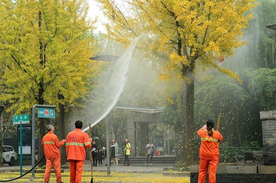 日前,一位摄影爱好者拍摄了环卫工人用近2米的水柱,冲刷着还未凋零的杏叶,这组照片在朋友圈迅速引发热议。