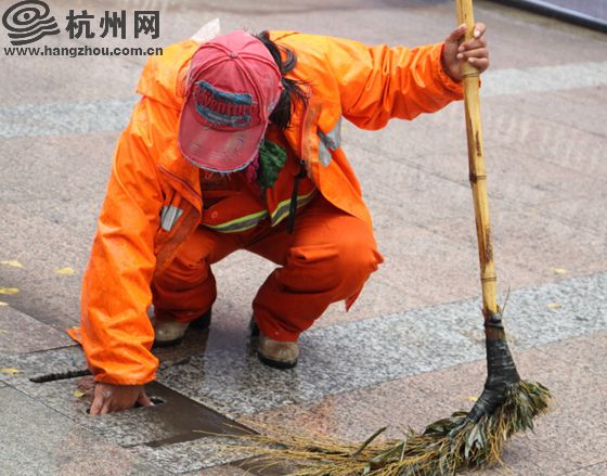 平海路区块人流量大,是通往西湖的必经之路。记者注意到环卫工人时不时地蹲下,把覆盖在道板砖下水口处的银杏叶拨开,因为满地的银杏叶容易堵塞下水道,清理干净才能让雨水顺利流出。