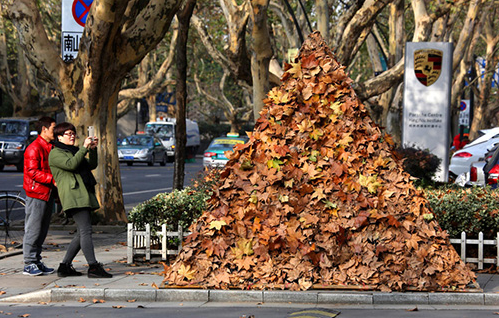 2014年有人在美院南山校区用落叶堆了一座“金字塔”,引来不少过路的游客来围观,还在“落叶金字塔”边留影。