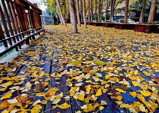 杭州网讯 杭州平海路靠近西湖的银杏林泛黄,一夜秋雨过后,银杏叶洒满一地,像是顽皮的工匠打翻了颜料桶,留下抹抹金黄。