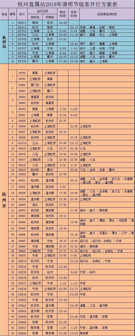 杭州直属站清明假期临客开行方案表(具体开行日期由集团公司客调命令公布为准)