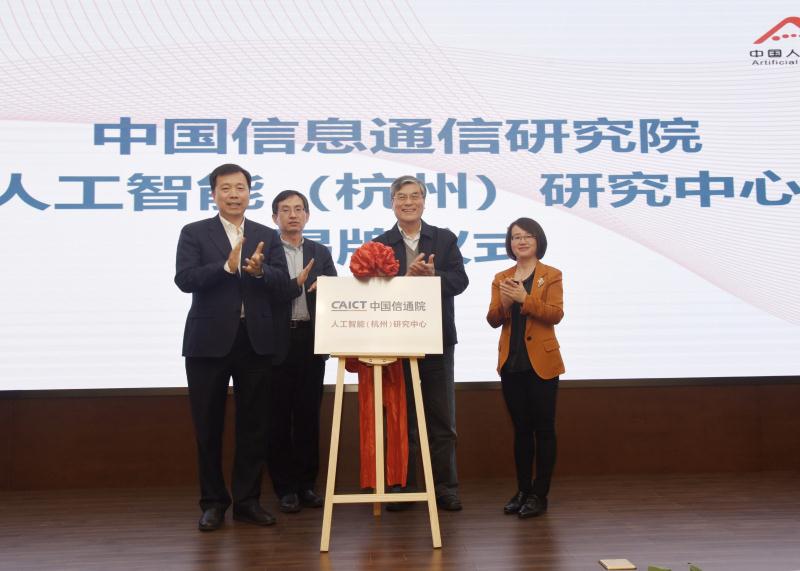 4月3日,中国人工智能产业发展联盟2019年第一次全体会议在未来科技城人工智能小镇举行。会上,中国工程院院士潘云鹤,中国信息通信研究院总工程师余晓晖,市委常委、区委书记张振丰,中国信息通信研究院云大所副所长张雪丽共同为中国信息通信研究院人工智能(杭州)研究中心成立揭牌。