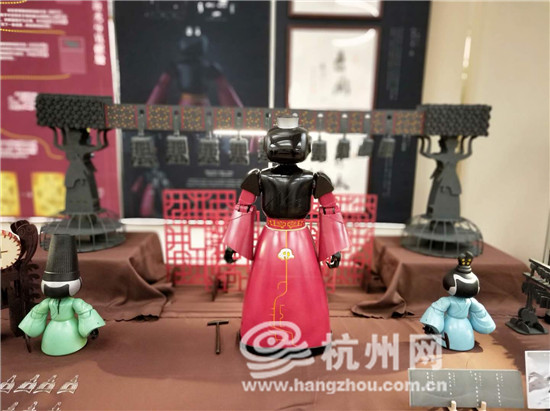 现场展示的是编钟机器人及宫女、乐师机器人。编钟机器人依据曾侯乙形象设计,用户以楚王的身份与其互动。利用现代技术还原曾侯乙编钟的演奏形式,弘扬曾侯乙编钟的礼乐文化。