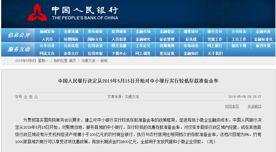 市场期盼已久的定向降准终于“落地”。根据央行今日(5月6日)发布的消息,将从2019年5月15日开始,对聚焦当地、服务县域的中小银行,实行较低的优惠存款准备金率,旨在建立对中小银行实行较低存款准备金率的政策框架,促进降低小微企业融资成本。