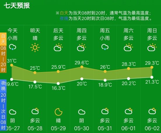 30日开始,暖湿气温有所增强,杭州处在降雨区的北部边缘位置,天空云开始增多,虽然气温不超过30℃,但是湿度大,人体感觉会有些闷热。30日后期到31日还可能会有些阵雨或雷雨。6月1日-2日,杭州多云天气为主,最高气温30℃。
