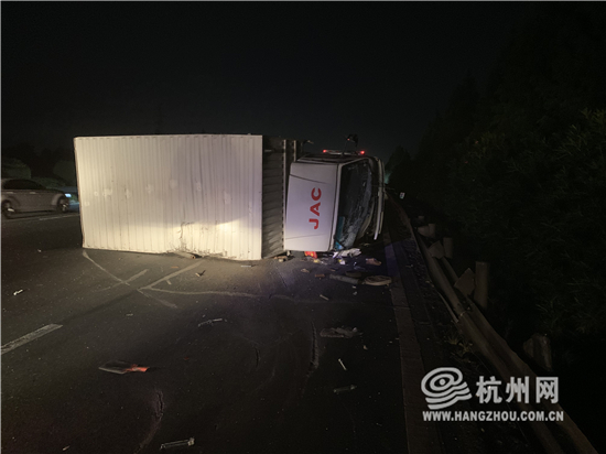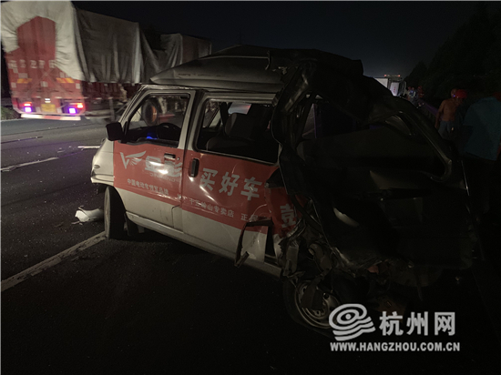 事故发生在8月5日晚上7点半左右。当时,高速交警杭州支队二大队接到司机报警:G92杭甬高速往杭州方向约200公里处,一辆大货车追尾了一辆因为车辆故障停在路面上的微型面包车,面包车被撞飞几十米,打了几个转后撞停在护栏上,大货车也由于强大的惯性侧翻在了车道内。