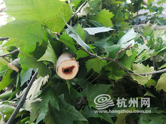 一圈又一圈的灯带,会影响悬铃木的自然褪皮,老皮脱落不掉,新皮长不出来,这样很容易滋生病虫。张军拿起一枝刚被剪断的树枝说;“这根树枝被剪断才发现有被虫蛀蚀的洞,本来3到4月份是为树除虫的最佳时期,但是灯带的捆绑让我们很难为悬铃木‘打针’”。