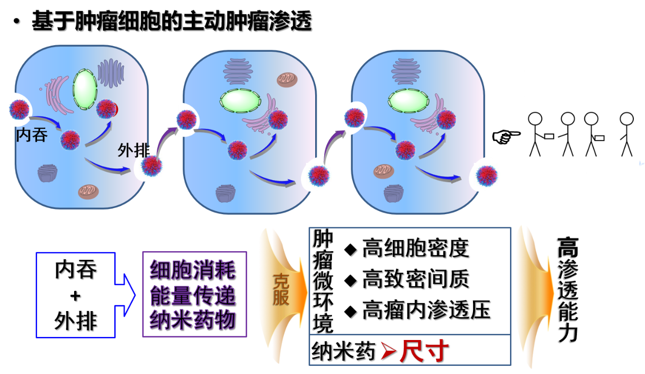 有没有可能发挥肿瘤细胞的“主动性”、让其“主动”地递送纳米药呢?这样既利用了瘤内高端细胞密度,又让纳米药直接在肿瘤细胞内穿行、绕开肿瘤细胞外基质这些“致密蔓藤”障碍。为此,申有青等设计了肿瘤细胞主动递送药物的方法:让肿瘤细胞一边吞噬纳米药,然后在另一边将一部分吐出来,这样循环往复,就将纳米药从肿瘤毛细血管处传递出去,到达每个肿瘤细胞。