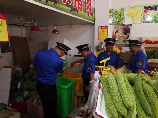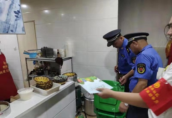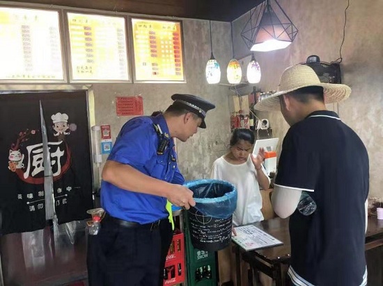 督查当天,执法队员们和督察组成员们以徒步巡查的方式深入查看各个区域的垃圾分类工作,检查超市、水果店、餐饮店、便利店、五金店等是否落实“桶长制”、室内是否配备正规垃圾桶、是否正确投放垃圾、店外是否有乱扔垃圾现象。“整治中我们会重点关注餐饮店,因为餐饮店的性质导致垃圾分类工作尤为重要,所以需要重点进行督查。” 执法队员介绍。