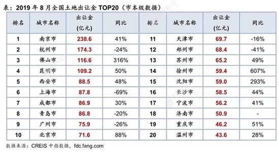 根据中国指数研究院数据,2019年1-8月,杭州以1845亿元的土地成交金额遥遥领先其他城市,位于全国土地成交城市TOP1。