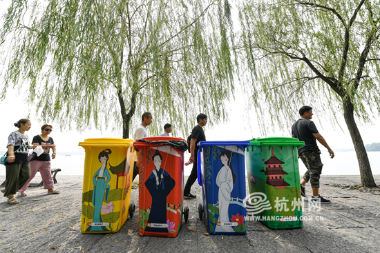 新颖而又应景的垃圾桶成为西湖一景。