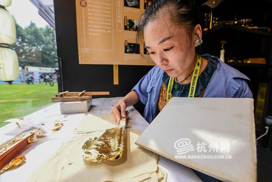 工作人员正在制作“箔爱”杭州明信片。