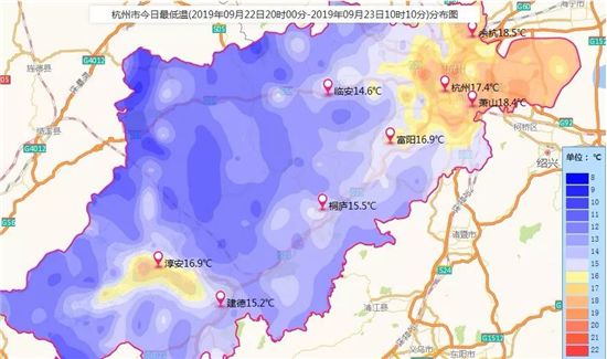 杭州网讯 台风“塔巴”影响过后,今天(23日)杭州恢复了晴到多云的好天气,受夜间辐射降温影响,早晨全市最低气温普遍仅14-19度,主城区17.4度,为6月15日以来的最低。
