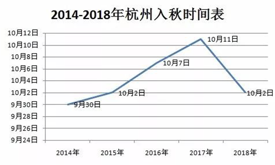 按照入秋的标准-连续5天平均气温小于22度统计,常年(1981-2010年)杭州入秋时间在9月下旬,最近五年,杭州都在9月底10月初完成夏秋转换。