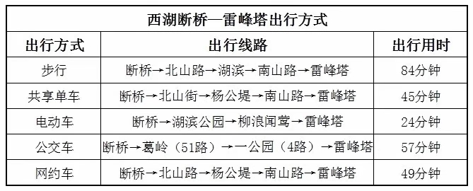 前段时间,景区分局邀请了5位研究员,以电动车、共享单车、网约车、公交车、步行5种不同出行方式统一从断桥集合出发到雷峰塔。