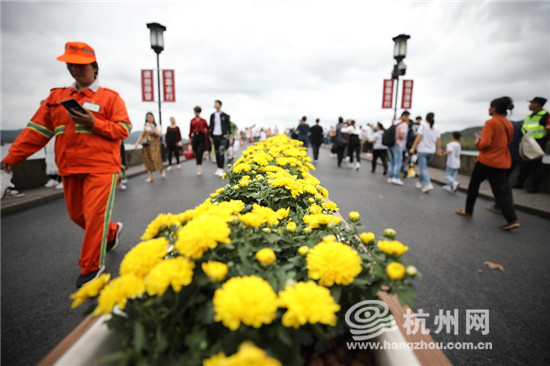 今年的断桥还“飞”来了700多盆鲜花,亮黄色的黄小菊,十分衬托杭州秋天的气质。这700多盆鲜花在断桥上形成了一条“隔离带”,被称作断桥“小飞虹”,既美化了景观,也起到疏散和分流游客的作用。