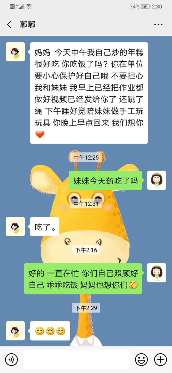 不仅仅是她,她的丈夫和公公也是社工,分别在杭玻阔板桥社区和半山社区工作,社工之家的他们,全身心地投入到抗疫一线,每天早出晚归,走访排查,宣传联系,无法顾及家里的孩子,只能早早地将一双年幼的女儿送到外婆家照顾。但是,大女儿的寒假作业没人辅导怎么办,小女儿还要泡奶换衣呢?王媚媚想了办法,用手机开启“云养娃”模式,大女儿的背诵作业通过录音从手机那头传过来,遇到学习问题抽空通过手机语音或视频进行联系并解决,外婆也会将小女儿穿衣吃饭的日常情况通过手机照片进行传送,想女儿的时候听听语音,看看视频缓解思念。