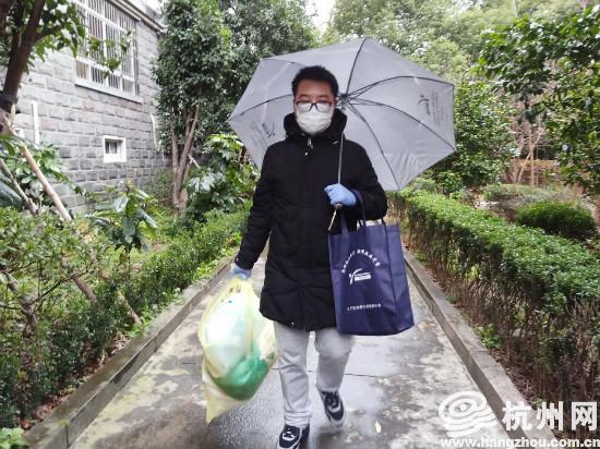 闸弄口社区新社工张凯翔,96年的年轻人,从大年初四开始加班,这已经是他为隔离点群众“送菜上门”的第十天了,虽然天气不佳,但是小张还是抓紧时间满足大家的需求。