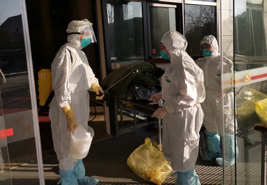 大年初一早上8点,接到任务的黄玉和郑贞娣迅速整装出发,与杨笛医生一起,前往市委党校集中隔离点开展疫情流调和消杀工作,直到晚上八点才结束当天的任务。