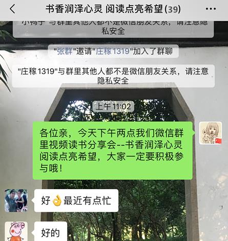 “这段期间,不方便出去,在家刚好可以看看书。今天通过微信,见到几位好久没见面的老朋友,一起聊天,一起聊读书,很高兴。”肢体残疾的林女士说,这是她第一次在微信群里通过视频聊天与大家见面,感觉很新奇,“希望今后能多举办这些活动,大家虽不便出门,但在网上可以多交流、见面。”
