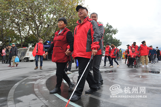 11月26日,来自全市14个区、县(市)的90余位盲人市民及陪护在杭州市盲人协会的组织下,体验湖滨步行街的无障碍设施。