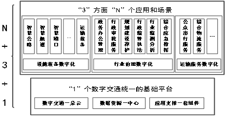 其中,1是数字交通统一的基础平台,通过建设数字交通一朵云、数据资源一中心、应用支撑一套组件,解决最底层部署问题,推动数据融合和行业赋能,避免重复建设;3即着力推动交通运输行业治理、设施装备、运输服务三个方面的数字化;N是基于三个方面延伸开展的N个应用和场景。