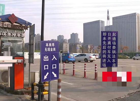 通过一段现场视频可以看到,该停车场名叫和茂东停车场,在停车场门口,竖着两块蓝底白字的公告牌,一块写着:即日起未开通先离场后付费的车辆将无法进入本车库。另一块写着:本岗亭无现金岗。