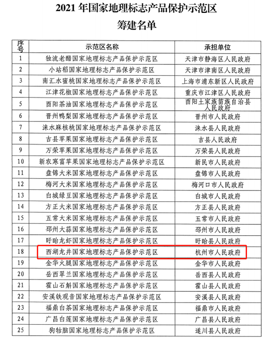 近日,经综合评审和公示,国家知识产权局公布2021年国家地理标志产品保护示范区创建名单,杭州市人民政府申报的“西湖龙井”茶国家地理标志产品保护示范区,成为全国首批筹建的国家地理标志产品保护示范区。