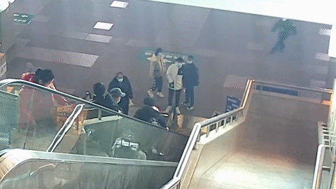 12月16日晚城站火车站广场发生惊险一幕一名旅客乘坐电动扶电梯时不慎摔倒滚落危机时刻只见两道藏蓝色如闪电一般冲向扶梯处火速展开救援及时避免了一场事故发生。