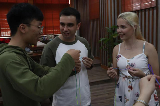 如何把颜色不一的细绳编织成一个五彩绳环对师生们来说是一个难题。每根绳子的排布都有规律,只要编错一根,整体的颜色就会不协调。不少外国留学生一边学一边直呼“So difficult!”