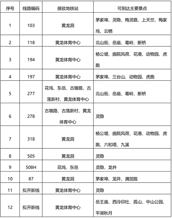 黄龙体育中心地铁站今后将是3号线与10号线的换乘站,西湖北线也近在咫尺,通过该站换乘公交进入景区将十分方便。杭州公交除对既有118、194、197路等线路的调度手段进行调整外,拟将黄龙体育中心地铁站B出口附近的原西湖体育馆公交站打造为景区北面的换乘枢纽,设置通往灵隐、北山街等地的公交线路。