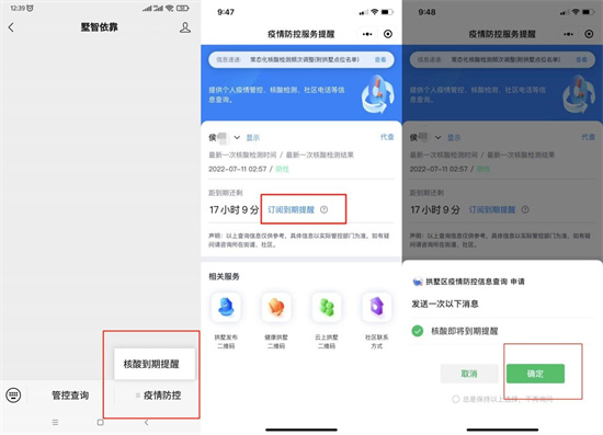 市民可以通过关注“墅智依靠”公众号、“健康拱墅”公众号或“拱墅区疫情防控信息查询”小程序,使用身份证号码登录,点击“订阅到期提醒”,即可在核酸即将过期时收到微信消息提醒,及时进行核酸检测。
