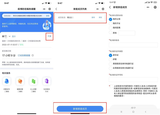 如果家里有不会使用智能手机的老人孩子怎么办呢?不必担心,小程序内还贴心地配有家庭成员代查功能,点击“代查”,选择“新增家庭成员”,添加家庭成员身份信息,就可以同步查看。