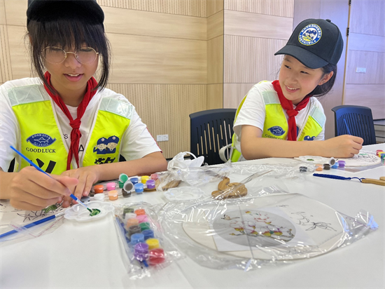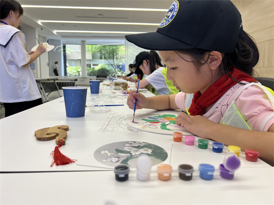 心灵书屋的邹老师现场悉心教学,为“小义警”们介绍了团扇的相关知识。比如,一把团扇通常由扇骨、扇面、扇柄、流苏等配饰组成,形状有圆形、长方形、芭蕉形等。在邹老师的带领下,“小义警”们一起执笔画团扇,洗笔、沾墨、染色,沉浸式感受宋代独特的文化和魅力。不一会儿,夏日的荷花、枝头的麻雀便跃然于纸上,整场活动轻松有趣、充满宋韵风雅。