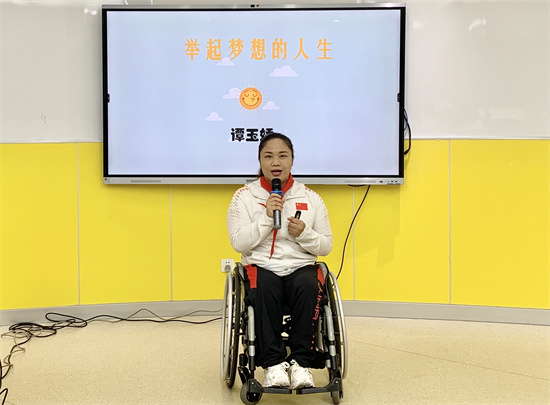 “从一个上不了体育课的残疾小孩,成为一名残疾人举重运动员,再到成为残奥会举重冠军、世界纪录保持者……我举起的不仅是自己的人生和梦想,更是一份沉甸甸的国家荣耀!”浙江残疾人运动员谭玉娇用朴实的话语向同学们传递着满满正能量。