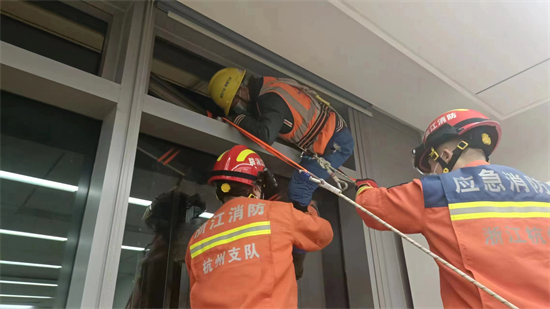 见状,在做好维护工作后,消防员们立刻赶到了28楼,看到工人们在窗外束手无策,消防员们立刻使用电钻和小型切割机等装备将两人所在位置附近的窗户进行破拆。很快,窗户被卸下,两名消防员做好个人安全防护后,探出窗户,给两名被困工人也做好安全防护,然后慢慢地将他们依次从破拆掉的窗户缺口接到楼内。