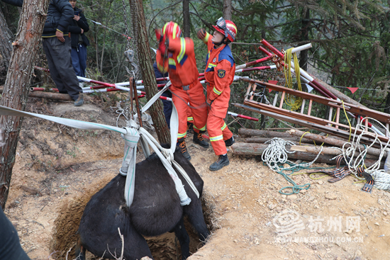 2月2日中午时分,淳安县消防救援大队接到报警称:梓桐镇练溪村附近的山坡上,一头约250千克的骡子掉入4米深坑中,请求救援。