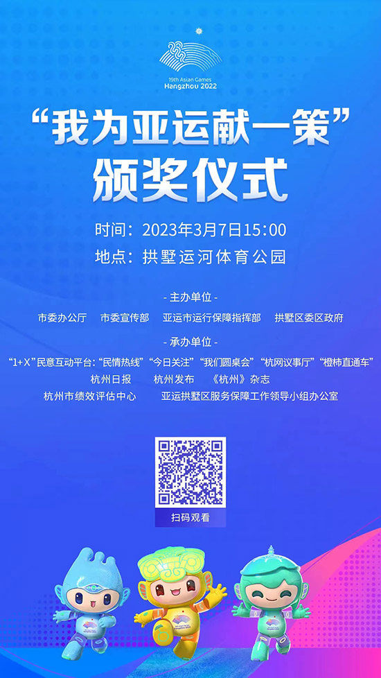由杭州市委办公厅、市委宣传部、亚运市运行保障指挥部牵头实施的“我为亚运献一策”金点子征集颁奖活动,将于2023年3月7日15时至16时在拱墅区大运河亚运公园举行。