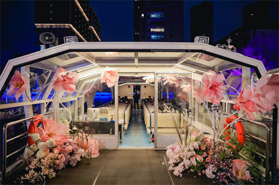 打卡点4:上塘古运河以“如梦上塘·花团锦簇”为主题,乘船观演《如梦上塘》多了一番景致,这艘花团锦簇的游船限时对市民游客开放,受邀的特定人员可免费乘坐。