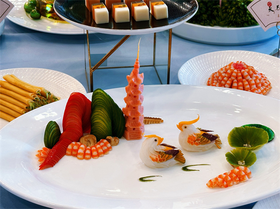 其作品将杭州当地美食融入西湖好春光,其中用食材雕刻出的鸳鸯更是栩栩如生。“雷锋塔是用火腿肠雕刻而成的,荷叶用的是青萝卜,鸳鸯比较复杂,我们想做出它的动态感,用白萝卜丝装饰鸳鸯颈部,翅膀的羽毛是用胡萝卜、紫薯、南瓜等食材雕刻而成。”绿茶餐厅厨师长熊志伟说。