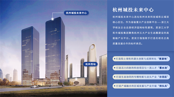 3月30日,杭州城投-浙江大学科技产业合作推进会举行,“杭州城投未来中心”正式宣布落户杭州云城,这标志着“名校+名企”“产业+平台”的校企深度合作新模式正式开启。
