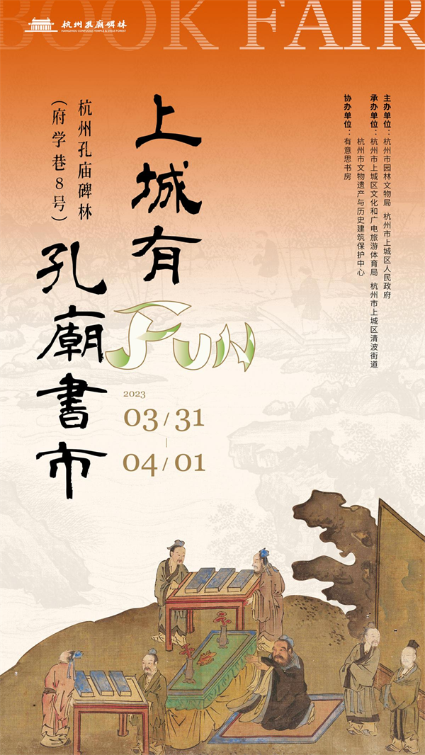 3月31日至4月1日,“上城有FUN,孔庙书市”在杭州孔庙举行,本次活动由杭州市园林文物局、杭州市上城区人民政府主办,杭州市上城区文化和广电旅游体育局、杭州市上城区清波街道、杭州市文物遗产与历史建筑保护中心承办,有意思书房协办。