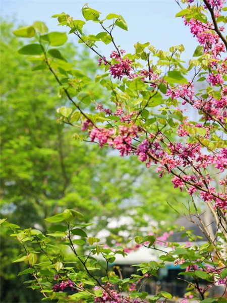 春半日暖,西溪绿意盈盈,各色春花点缀其间,正是一年好风景。洪园火柿路饱满的木绣球、园区各处缤纷浪漫的樱花、绿堤瀑布般的紫藤、随处可见的二月兰、绿堤大草坪烂漫的彩色油菜花海、主航道沿线的油菜花……共同将西溪打扮得明媚俏丽,虾龙滩的幌菊花海更是以一片梦幻蓝牢牢俘获了游人的心。幌菊也叫喜林草,花瓣蓝白相间,色彩纯净,有“婴儿的蓝眼睛”之称。虾龙滩共种植幌菊5000平方米,目前已渐入佳境,随手一拍就很出片。