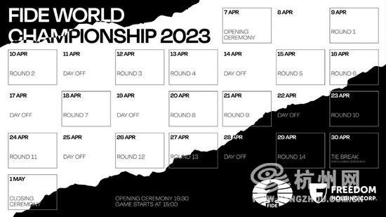 2023年国际象棋世界冠军赛中,双方进行慢棋大战,率先达到7.5分的棋手加冕“世界棋王”称号。若14盘慢棋赛后两位棋手积分相同,则在4月30日进行快棋加赛。比赛预计持续20余天,每轮比赛在当地时间15时(北京时间17时)开始。闭幕式在5月1日举行。赛事总奖金为200万欧元。