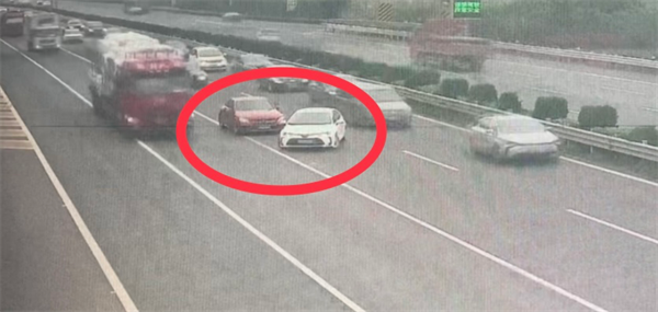 画面中显示,一辆白色小车显然已经错过出口的减速车道,却突然从第一车道往右紧急变更车道,在变更的过程中与右侧在第二车道内正常行驶的红色小车发生刮擦,使其方向发生偏移险些与第三车道上的货车发生事故。