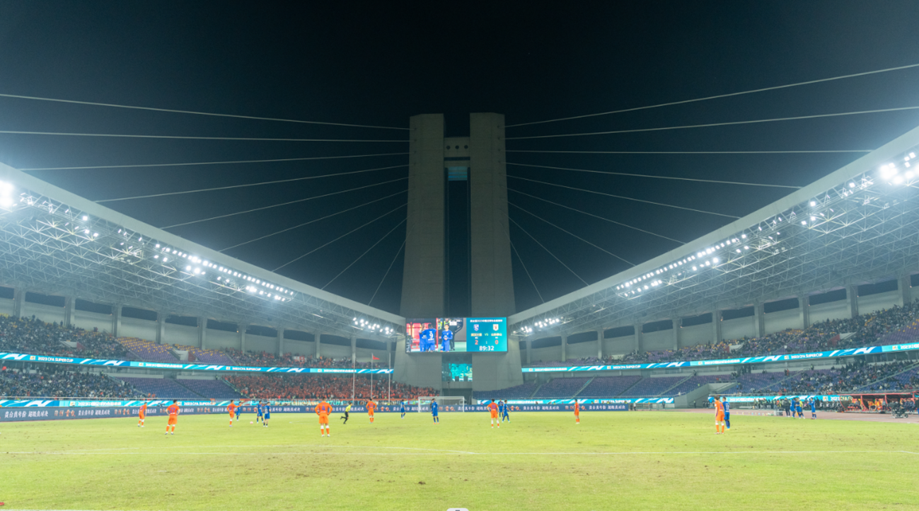 要知道,当晚黄龙给球迷带来声光电多方位、多角度观赛体验,精心打造了一套专业的体育展示。DJ音乐、灯光秀、LED大屏环廊等高科技手段的使用,全面提升了现场球迷的观赛效果,让他们不出国门就能享受到媲美欧洲顶级联赛的观赛体验。主办方还利用球场南北两侧的巨塔,对双方队徽、队服主色系以及两个冠军奖杯进行巨型投影,营造出巅峰对决的仪式感和炫酷感。
