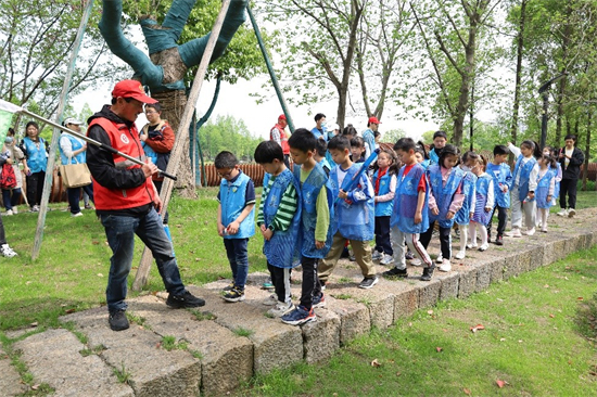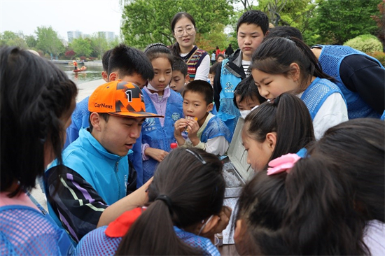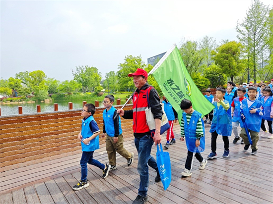 活动开始,孩子们先跟着水之味护水队的於松根爷爷巡查了一回丰收湖。於松根爷爷是九堡街道和睦港民间河长、新市民志愿服务中心志愿者,2015年起参加志愿服务,开展常态巡河护水活动,并引导更多居民践行护水治水、参与到“五水共治”中来,一起守护绿水青山。巡河护水是於爷爷的日常工作之一,在於爷爷的带领下,大家不仅领略到了丰收湖公园的美景,也对丰收湖的生态环境状况有了更近一步的了解。